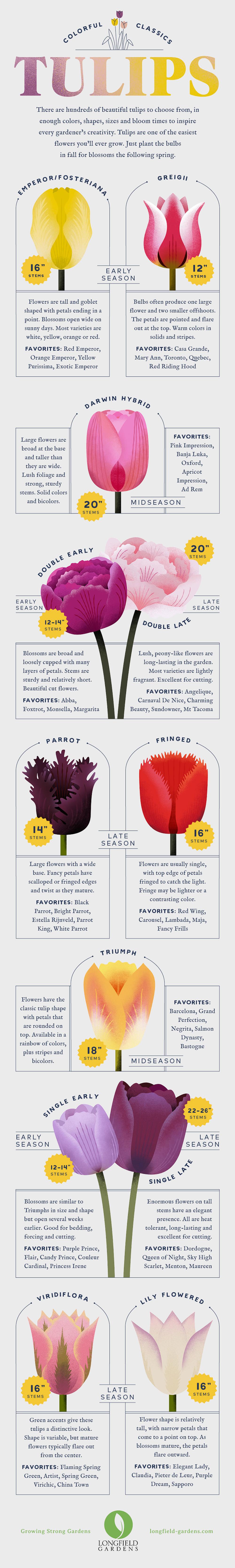 Tulips come in a rainbow of beautiful colors and can be used in so many creative ways. By combining different flower styles, heights and bloom times, you can have tulips flowering for months every spring. This infographic makes it easy to see the full range of options, so you can put on your own tulip extravaganza.