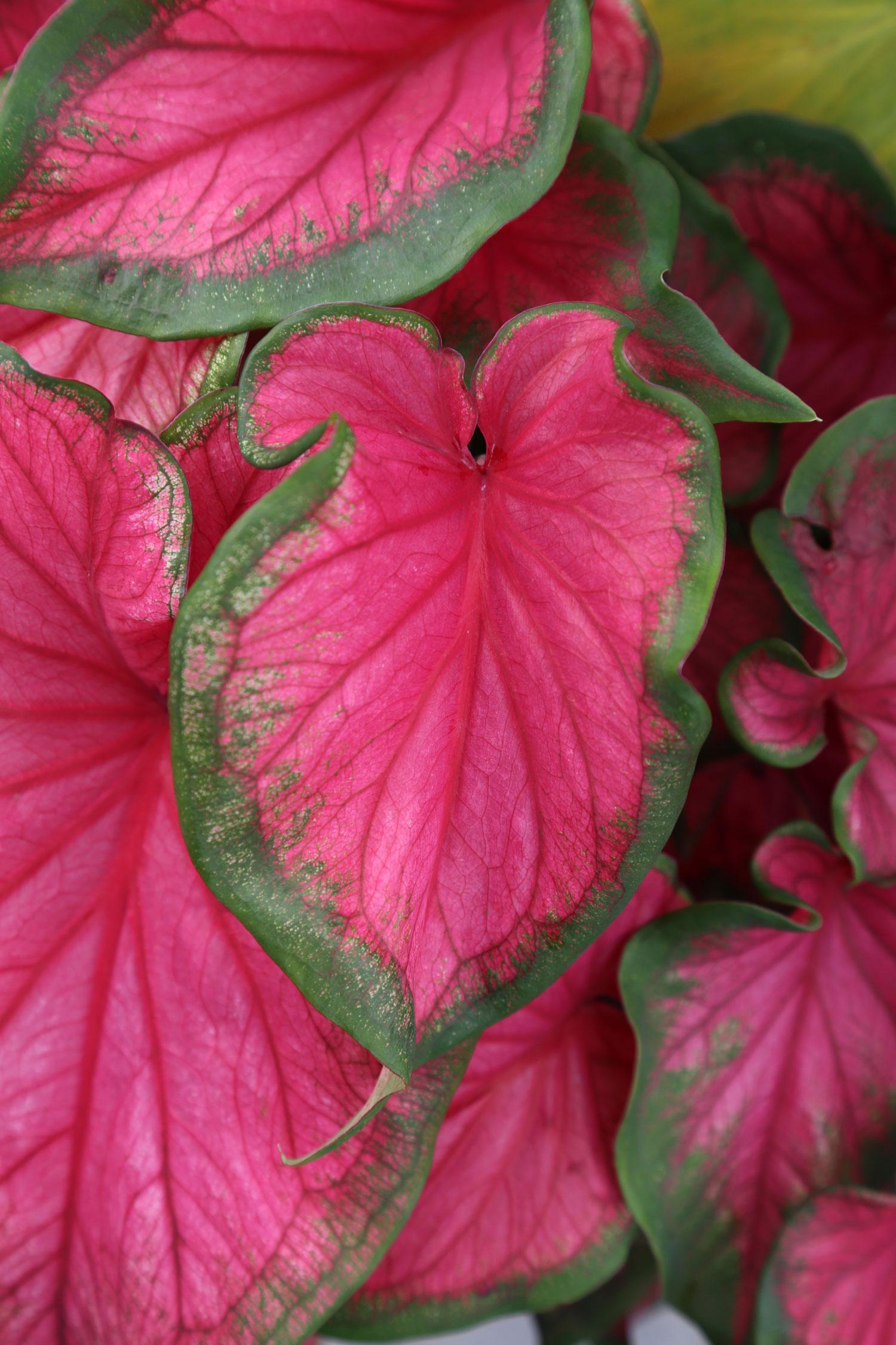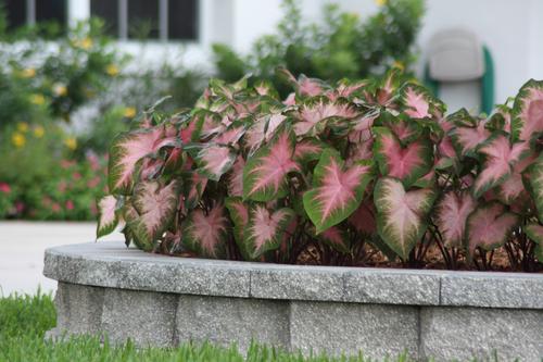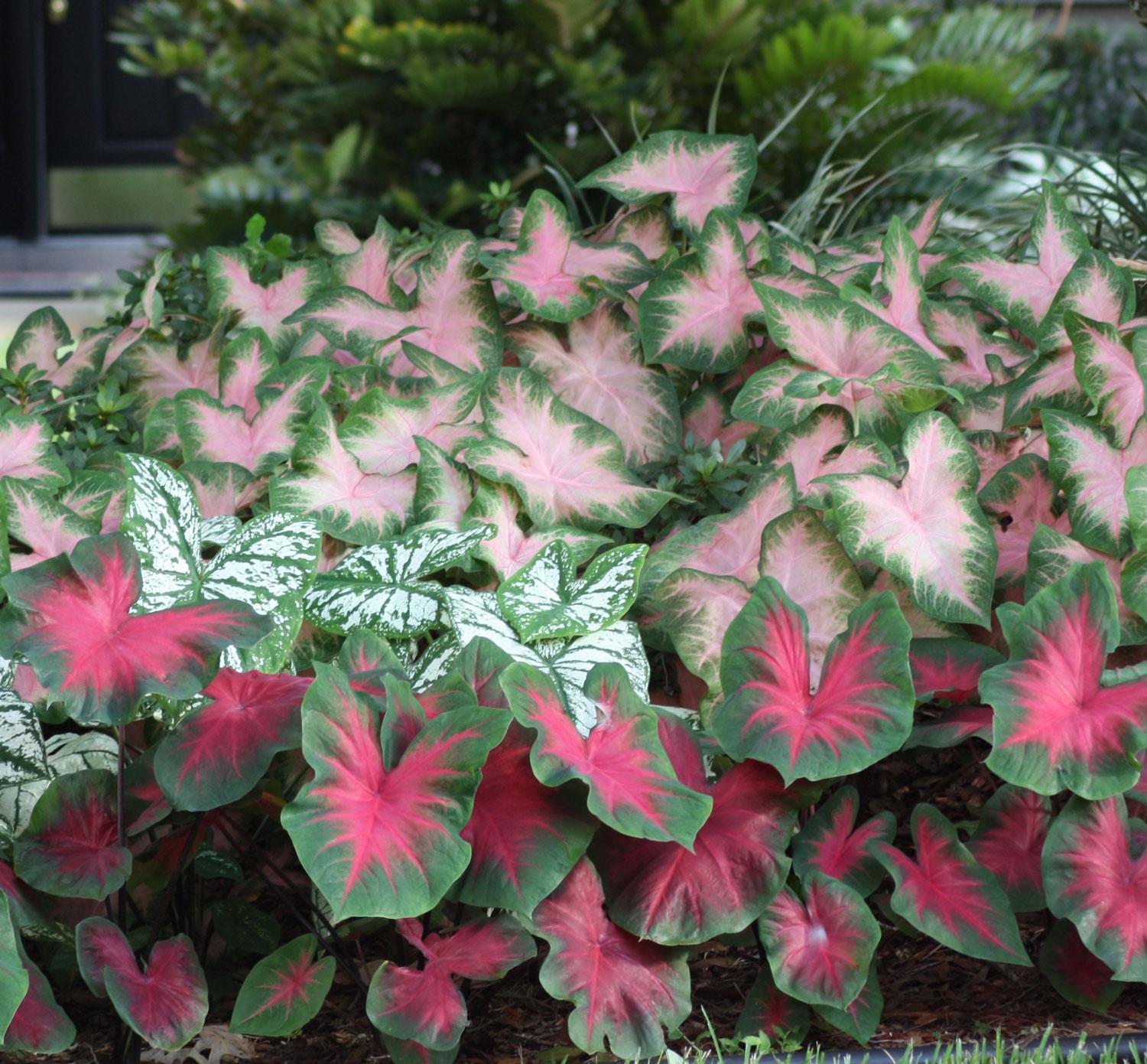 COMPANION PLANTS IN THE GARDEN: Depending on which varieties you choose, caladiums can be bright and flashy or cool and sophisticated. The pinks, greens and whites pair beautifully with other soft colors, and the red-leaved varieties can hold their own when combined with hot-colored begonias, coleus and impatiens.