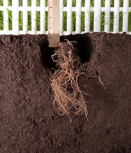 Dig a hole that’s large enough to contain all the roots. Position the plant in the hole so the crown of the plant (where the roots meet the stem) is positioned about 1” below the surrounding soil.