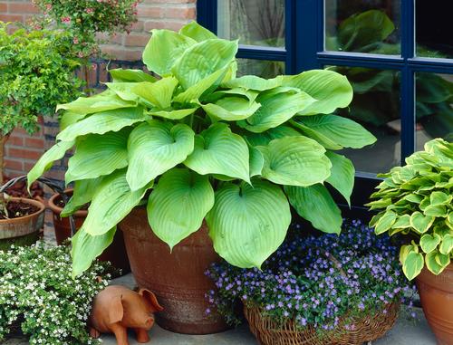 When planting a decorative container garden for a shady porch or patio, add a small or medium-leaved hosta. The foliage complements colorful annuals and will stay fresh all season long. In the fall, simply remove the plant and plant it in the garden.