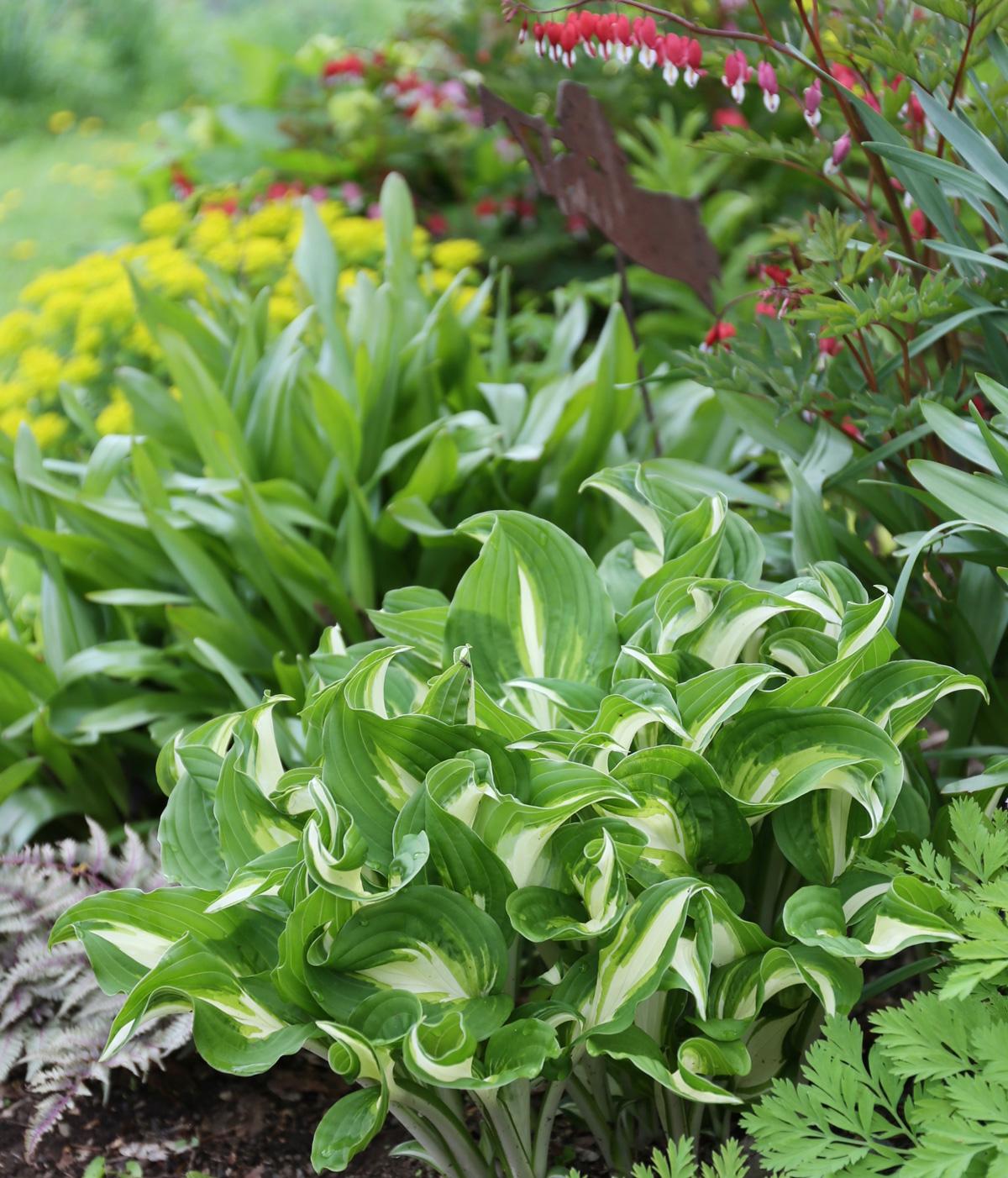 Finding interesting ways to combine these different types of foliage is part of the fun of growing hostas. Good companions include other shade lovers such as astilbe, bleeding heart, ferns, caladiums and begonias.