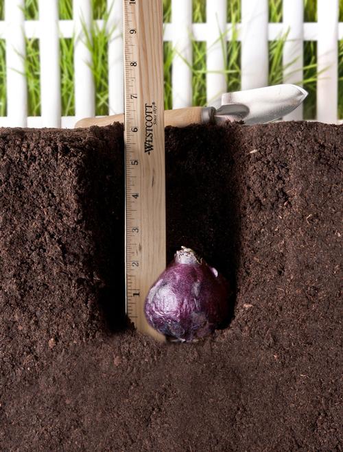 Depth and Spacing: Plant hyacinth bulbs 4 to 6” deep and 5 to 6” apart on center. You may plant the bulbs individually or dig out a larger area and plant 5 or more bulbs at the same time. Position the bulbs with the pointy end up and then cover them with soil. Fall and winter rains usually provide adequate moisture. Water only if the weather is unusually dry.