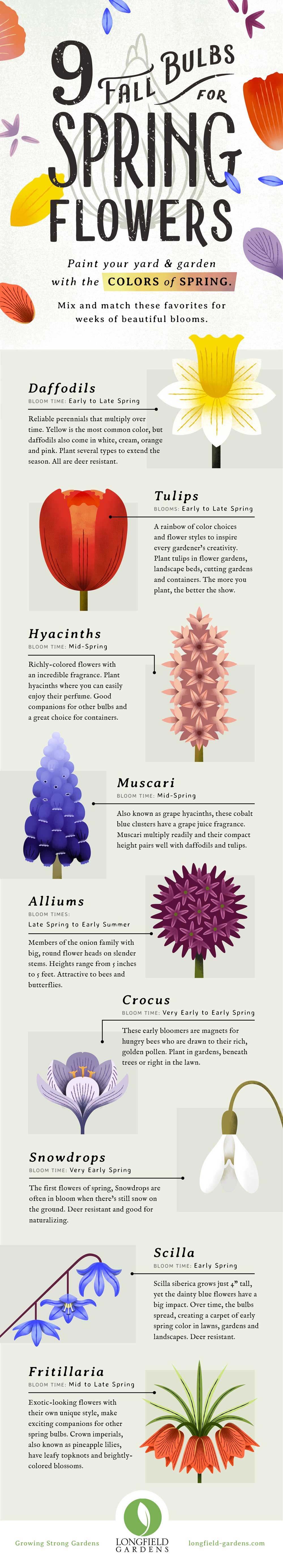 Start the season with early bloomers like snowdrops and crocus. Early daffodils and scilla flower next, followed by hyacinths and early-blooming tulips. April brings mid-season daffodils, mid-season tulips and muscari. May-flowering bulbs include fritillaria, late-blooming daffodils, late-blooming tulips and alliums.