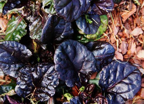 Bugleweed forms a dense, 6” high mat that is very weed resistant. The scalloped leaves come in many colors, from maroon to sage green, chocolate brown to almost black. Some varieties have glossy foliage and others have a flat, matte surface. Pretty, violet-blue flower spikes appear in late spring. Deer resistant.