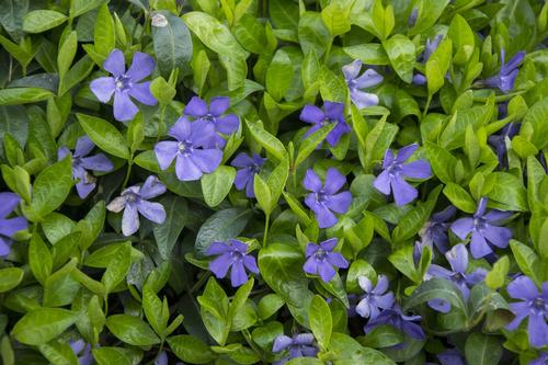 A creeping ground cover with small shiny leaves on wiry stems. The trailing stems root as they run to fill in any open spaces. Vinca prefers moist soil. Flowers appear inlate spring and come in white, blue or lavender. Some varieties have variegated foliage. Grows 3-5” tall.