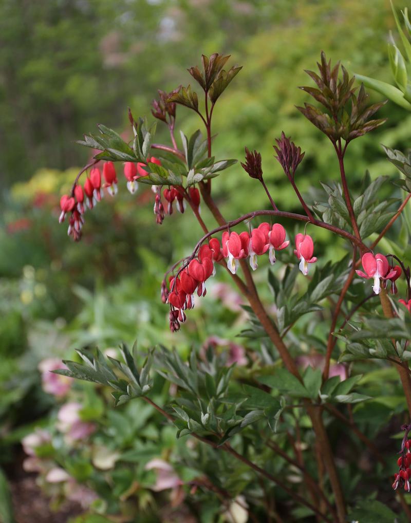 This plant is named for its heart-shaped flowers. There are two types. The traditional one is Dicentra spectablis and it starts blooming along with the daffodils. It grows 3 feet tall and displays its flowers in a row on slender, arching stems. The flowers can be deep pink, red or white. After flowering, it dies back to the ground. The other type grows 6 to 10” tall and displays smaller clusters of hearts. It begins blooming a few weeks later than the other type and retains its fern-like foliage all season.