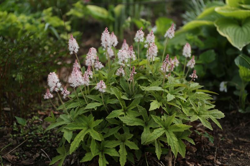 Easy, long-lived plants that are related to heuchera. Leaves are smaller, have a fuzzy surface and may display red or purple veins. Plants are 8 to 12” tall. Pale pink, bottle-brush flowers. Native varieties spread by stolons or runners and are a good ground cover. Named varieties such as ‘Sugar and Spice’ or ‘Pink Skyrocket’ tend to stay where they are planted.