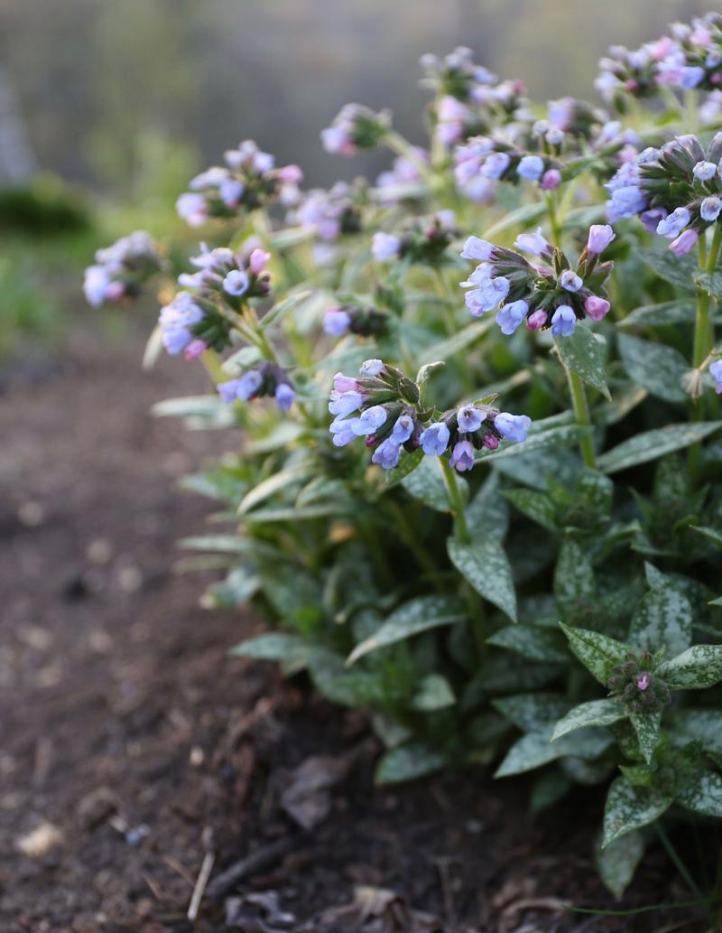 A lovely plant with a mounding habit that grows 12-18” tall. The soft, slightly hairy leaves are speckled with white spots. Blooms prolifically, producing flower clusters that typically have a mix of blue and pink florets. Bees love it.
