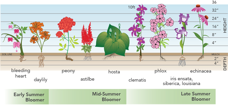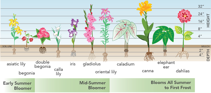 If you want your flower garden to be colorful from early spring through fall, you need plants that bloom at different times during the growing season. Each type of plant has its own bloom time. Combining a few plants from each season -- spring, early summer, midsummer, late summer and fall -- will ensure your garden always has flowers in bloom. To see our infographic on the bloom times for spring-flowering bulbs, click here.