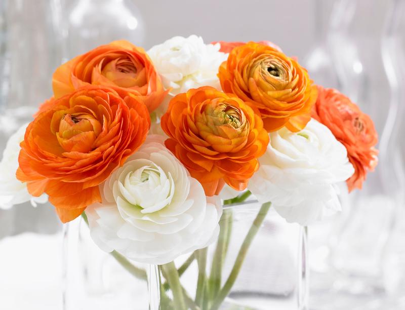 Ranunculus have cup-like blossoms with a multitude of paper-thin petals. They have the same lush, romantic appeal as peonies, but the color choices are simply incredible, from pure white through peach, yellow, pink, orange, red and burgundy, plus many gorgeous bi-colors.