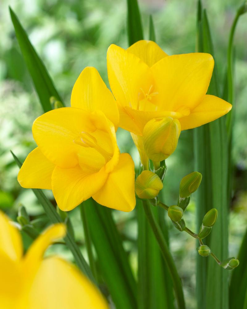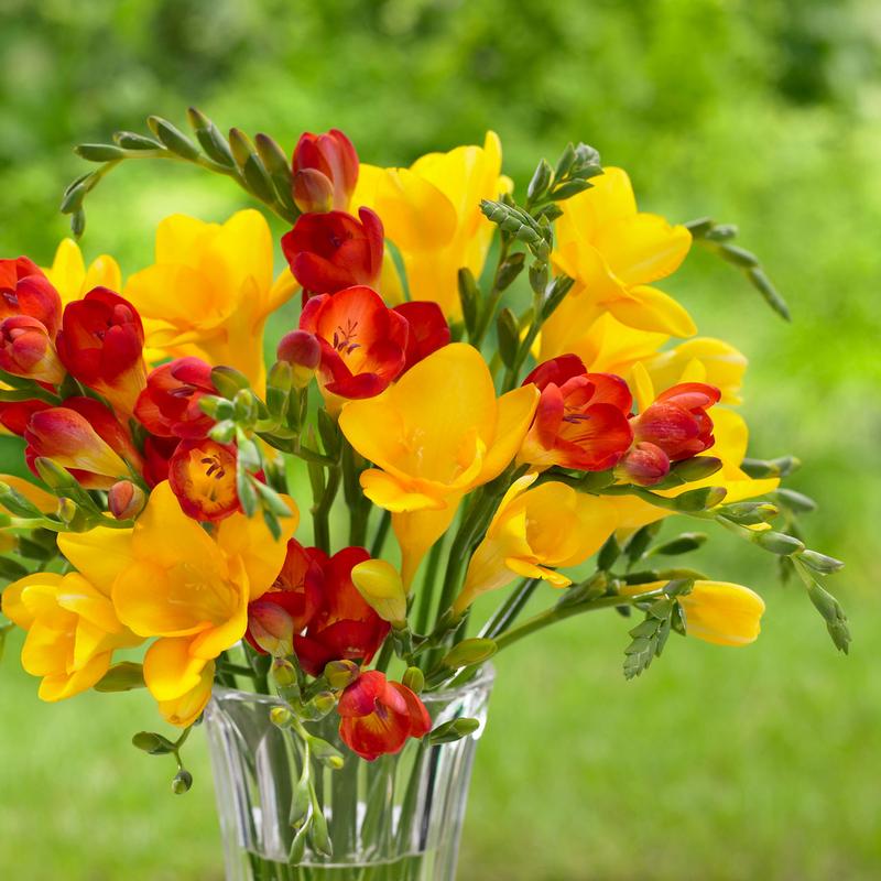 Freesias are native to South Africa and have been grown for cut flowers since the 1800s. They are loved for their fresh, sweet fragrance, which may remind you of baby powder. Freesias have 6 to 10 funnel-shaped blossoms per stem, and they open sequentially, from the bottom up. Colors include white, pink, yellow, red and violet-blue. The plants grow about 12” tall and have light green, sword-like foliage.