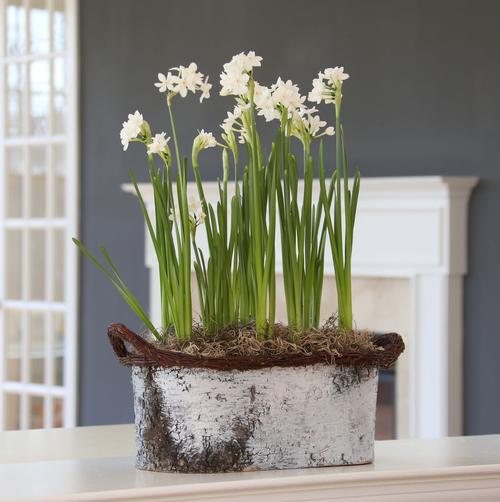 You can grow paperwhite bulbs in a shallow dish filled with stones and a little water. But planting them in 6" nursery pots gives you many more decorating options. Fill the pots with about 3" of moist growing mix and position the bulbs on top so they are almost touching. Cover the bulbs with more soil and water to settle them in. For hostess gifts, consider using smaller pots with just enough room for 3 bulbs.