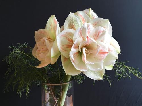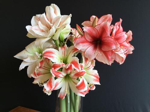 The arrangement shown here features four different varieties of winter-blooming amaryllis including Ice Queen, Nymph and Charisma. To learn more about using amaryllis for cut flowers, read this blog post: How to Use Amaryllis as Cut Flowers.