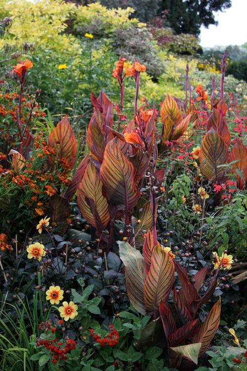 Canna foliage can inspire all sorts of wonderful plant combinations. In the second photo above, Tropicanna and Tropicanna Gold have been planted with coleus, amaranth, gaillardia, helianthus and lantana. It’s an eye-catching late summer display that will keep going right through the fall.