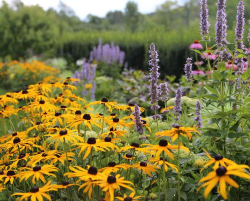This late summer perennial is better known as black-eyed Susan. Its daisy-like flowers have dark brown centers surrounded by golden-yellow petals. Rudbeckia grows almost anywhere, as it's not fussy about soil or moisture. After the flowers fade, the seed-filled centers attract goldfinches and other songbirds. Generally grows about 24" tall.