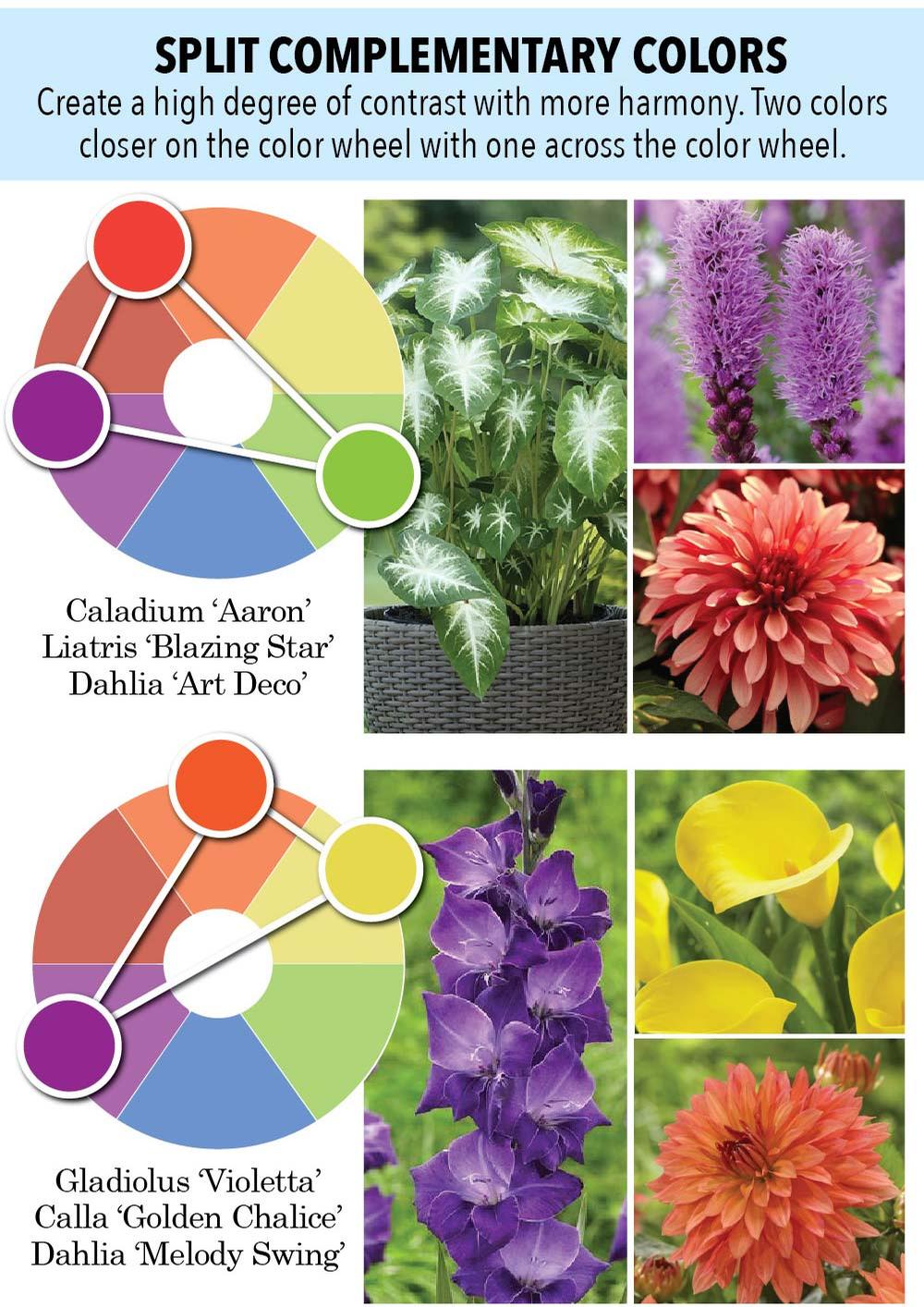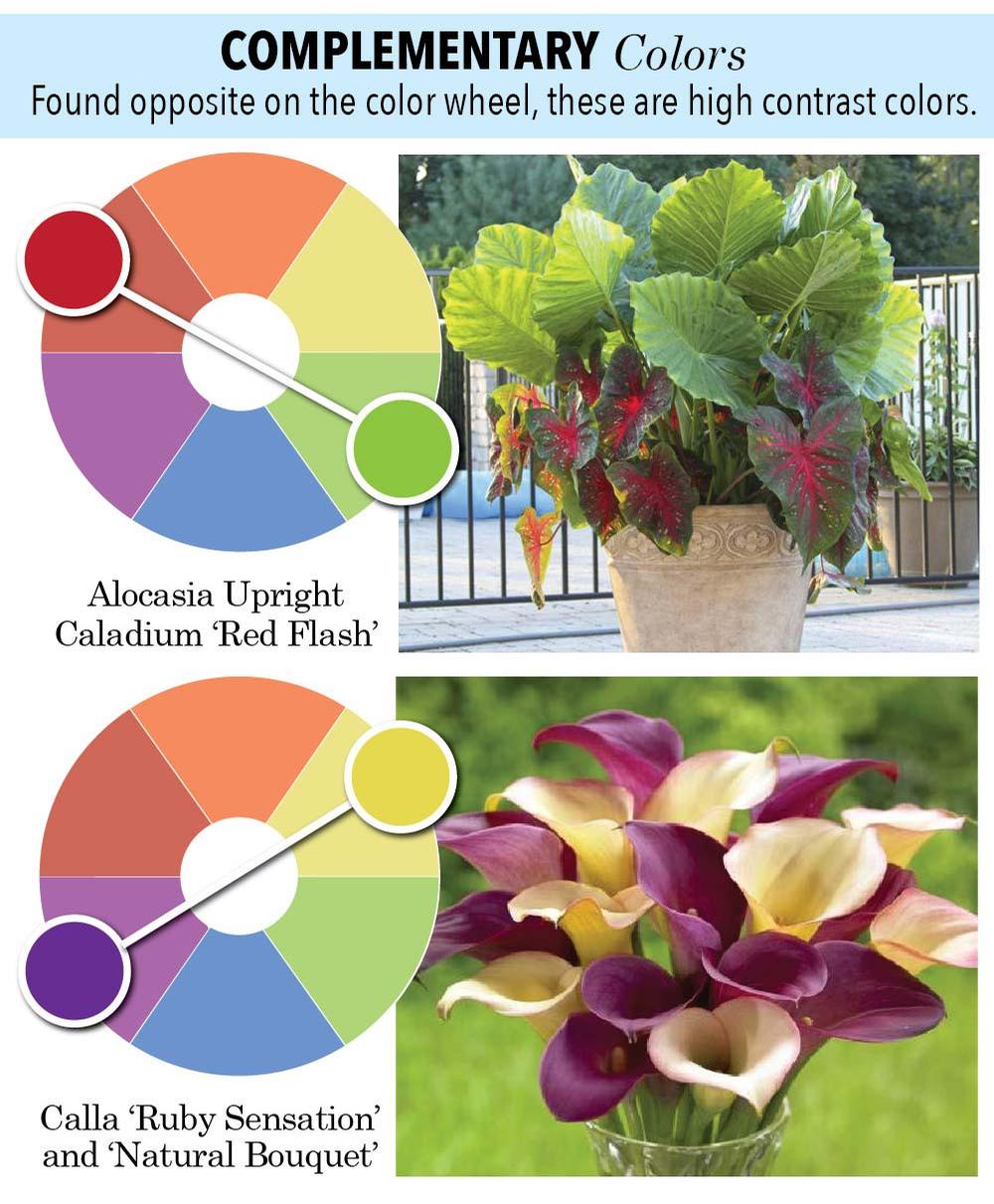 Examples of complementary color pairs include yellow and purple, orange and blue, and red and green. Using complementary colors in the garden conveys boldness, energy and excitement.
