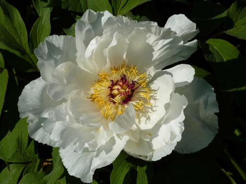 Tree peonies have woody stems like a shrub and can reach 5 feet tall. They are the first peonies to bloom each spring and start opening at about the same time as late season tulips. The flowers are much larger than standard peonies (up to 10” across) and they come in a wider range of colors, including cream, yellow, gold, coral, lavender, pink and deep red. The white peony shown at left is Paeonia suffruiticosa 'Renkaku'.