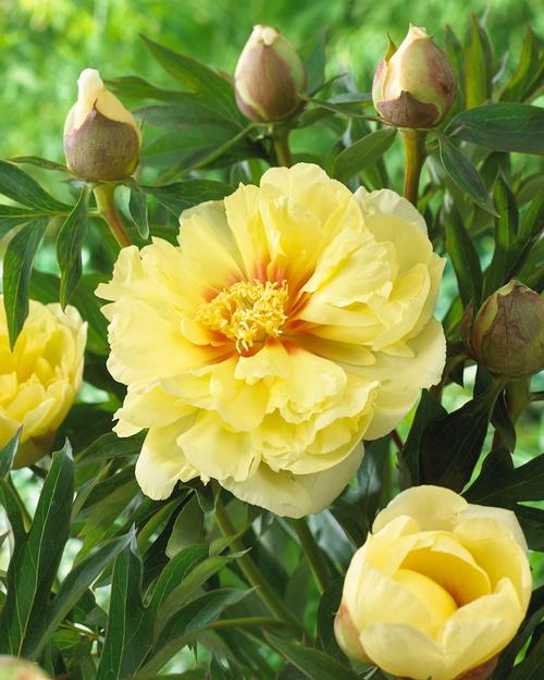 Intersectional peonies are also known as "Itohs" for the breeder who introduced them. They are hybrids created by crossing an herbaceous peony with a tree peony. Itohs die back to the ground like herbaceous peonies. This makes Itohs hardier than tree peonies, yet their flowers are as just as large and are available in a similar range of colors. The foliage of Itohs resembles that of a tree peony and the stems are extremely strong, so they're excellent cut flowers. A mature plant can produce as many as 50 blossoms. The Itoh variety shown at left is Bartzella.