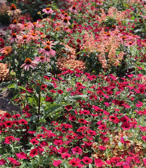 Most people would say red and pink don’t go together. But that’s not always the case. Warm pink echinacea (with its orange cones) actually works beautifully with warm red petunias and coral pink salvias. The key to success is keeping warm with warm. Had this garden included fuchsia petunias rather than dark red, the combination would not have been as pleasing.