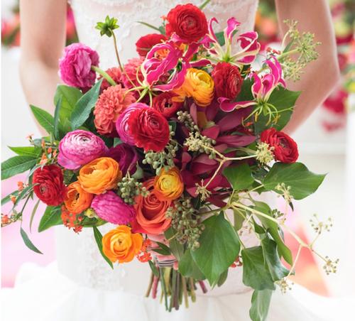 In this vibrant wedding bouquet, posted on Flirtyfleurs.com, you see how beautifully warm pinks can be combined with orange and even yellow.