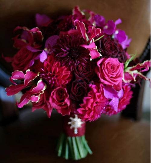 Pinks with a slightly blue cast are considered cool pinks. Flowers with a cool pink hue look beautiful paired with violet, burgundy and purple (as you see here in another wedding bouquet posted on Flirtyfleurs.com). All of these colors contain true red and varying amounts of blue. In color theory, they are called analogous colors, which means they are adjacent to each other on the color wheel. When choosing flowers for your garden, combining analogous colors ensures a pleasing color harmony.