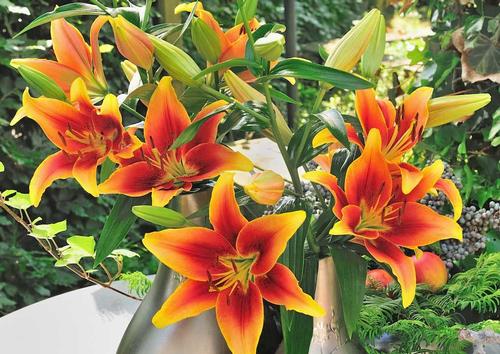 Asiatic-Oriental lilies are relatively recent hybrids that combine the brilliant colors of Asiatic lilies with the larger flowers and taller stature of an Oriental lily. They were developed for the cut flower industry, but in addition to being great for bouquets, they are also excellent garden plants. AO lilies are 3 to 4 feet tall, which is a perfect height for perennial gardens. They also grow very well in containers. Shown at left is 'Kaveri'.