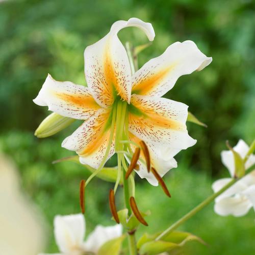 Oriental Lilies bloom from mid to late summer. They have large, outward-facing flowers that open wide and are more flat than trumpet-like. The pink and white lily known as ‘Stargazer’ is a type of Oriental lily. Flower colors for Oriental lilies range from yellow and white through pink and burgundy, with many displaying contrasting freckles or stripes on their petals. Double varieties are also available. Oriental lilies are ideal for perennial gardens and they also grow very well in containers. Heights range from 3 to 4 feet tall. As cut flowers, their lovely fragrance will fill an entire room. The lily at left is 'Colorado'.
