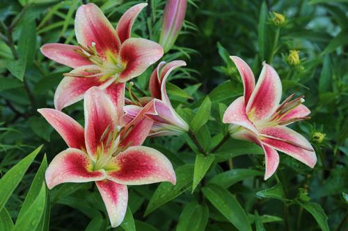 Asiatic lilies are the first lilies of the season and usually start flowering in June, right after the peonies. Asiatics are also the shortest type of lily, typically standing about 2 to 3 feet tall. Their upward-facing flowers come in many different colors, from white through yellow, orange, pink, red and deep burgundy. Asiatic lilies do not have a fragrance, but their flowers add bold, bright color to early summer gardens. These lilies also grow well in containers and make great cut flowers. Shown at left is 'Lollypop'.