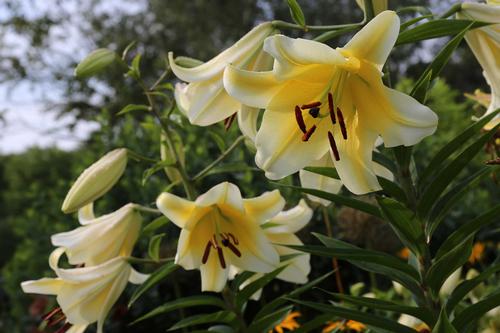 Trumpet lilies begin blooming in midsummer. The flowers have long, narrow trumpets and come in white, cream, yellow, peach and pink. Trumpet lilies tower over other perennials, often reaching a height of 4 to 6 feet. Their flowers are deeply fragrant, and just a few plants will perfume your entire garden – especially in the evening. Shown at left is 'Golden Splendor'.