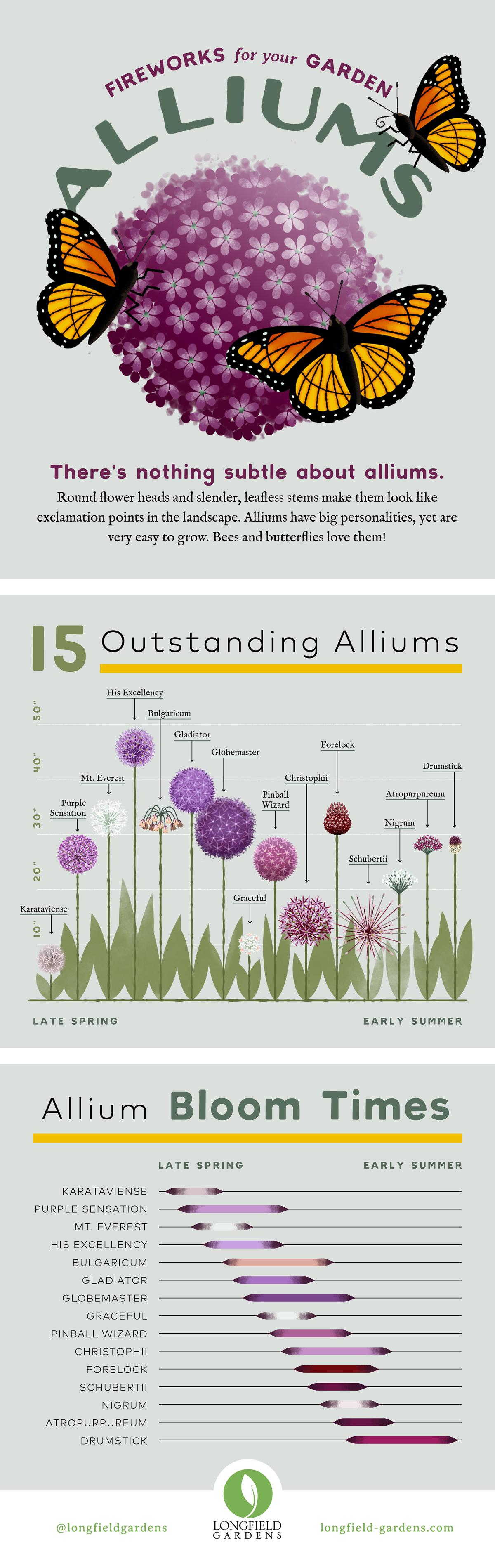 This new planning guide is an easy-to-use visual reference that shows all of these important features at a glance. We highlight 15 different types of alliums so you can get to know the full range of options. Now it's easier than ever to imagine new ways to put these great-looking flowers to work in your perennial gardens and other areas around your home.