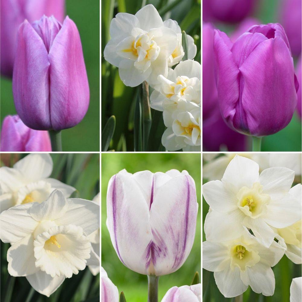 Tulips offer some of the garden's most beautiful blue hues. And nothing sets them off more effectively than frosty white daffodils. This collection includes two mid-season triumph tulips, Flaming Flag and Blue Beauty, plus Violet Beauty, a single late tulip. Daffodils are early-blooming Mount Hood, midseason Pueblo and late spring Cheerfulness.
