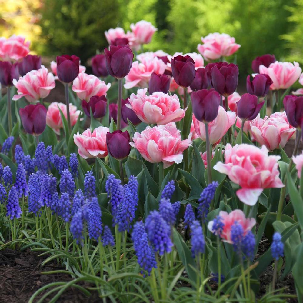 Sometimes we discover a great color combination by accident rather than by design. That's what happened when we paired the triumph tulip Purple Lady with early double Foxtrot and grape hyacinths. It wound up being one of our all time favorite pairings and we're sure you'll agree when you see these bulbs bloom in your own garden.